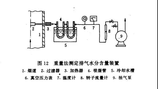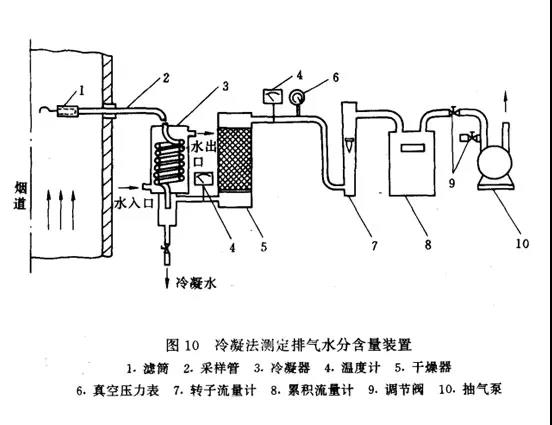 方法原理:煙道中抽取一定體積的排氣,使之通過冷凝器,根據冷凝出來的水量,加上從冷凝器排出的飽和氣體含有的水蒸汽量,計算排氣中的含濕量。