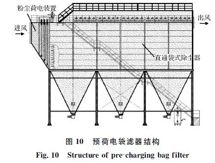 針對(duì)轉(zhuǎn)爐二次煙氣的排放特征,中鋼集團(tuán)天澄環(huán)保科技股份有限公司開(kāi)發(fā)了預(yù)荷電袋濾器除塵技術(shù),將預(yù)荷電和直通式袋式除塵器復(fù)合形成一體化裝置,如圖10所示。粉塵預(yù)荷電后在濾袋表面將形成海綿狀粉餅結(jié)構(gòu),能提高凈化效率,同時(shí)降低運(yùn)行阻力。中鋼天澄在鞍鋼煉鋼總廠2×180t轉(zhuǎn)爐二次煙氣凈化項(xiàng)目中建成示范工程,處理風(fēng)量2×60萬(wàn)m3/h。2014年12月正式投運(yùn),截止目前持續(xù)穩(wěn)定,運(yùn)行可靠,顆粒物排放質(zhì)量濃度低于10mg/m3,技術(shù)性能指標(biāo)達(dá)到超低排放,運(yùn)行阻力為700~1 000Pa,低于傳統(tǒng)袋式除塵器。目前,在日照鋼鐵、新余鋼鐵、正大特鋼、唐鋼青龍、柳鋼等得到推廣應(yīng)用。