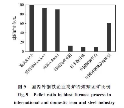 噸球團(tuán)礦的SO2和NOx排放量?jī)H為燒結(jié)礦的約1/2和1/3,提高高爐入爐原料中球團(tuán)礦比例,有利于實(shí)現(xiàn)鋼鐵行業(yè)硫硝源頭減排。目前,國(guó)內(nèi)外鋼鐵企業(yè)高爐冶煉球團(tuán)礦比例如圖9所示。歐美國(guó)家的高爐球團(tuán)礦比例普遍在90%以上,瑞典SSAB廠為100%全球團(tuán)冶煉,墨西哥Monclova廠為93%,美國(guó)Ashland廠為90%。亞洲國(guó)家高爐球團(tuán)礦占比普遍較低:韓國(guó)浦項(xiàng)光陽(yáng)廠為12%,日本新日鐵為10%,中國(guó)河鋼集團(tuán)平均為10%,主要是因?yàn)榍驁F(tuán)礦的堿度較低(堿度為0.1~0.2)。