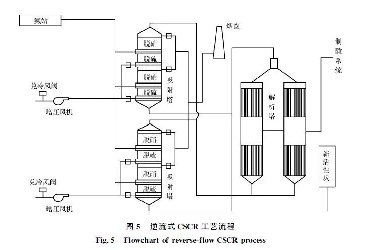 河鋼邯鋼在國(guó)內(nèi)率先選用了逆流式活性炭選擇性催化還原(CSCR)凈化燒結(jié)煙氣工藝,工藝流程如圖5所示。SO2通過(guò)活性炭的吸附-解析,再經(jīng)過(guò)催化氧化制成濃硫酸,實(shí)現(xiàn)了資源回收利用。通過(guò)脫硫段后,在上升的煙氣中進(jìn)行噴氨,進(jìn)入脫硝段后在活性炭的催化作用下NOx轉(zhuǎn)化為N2和水進(jìn)行脫硝。2018年2月邯鋼西區(qū)燒結(jié)機(jī)投運(yùn)了逆流式CSCR工藝,實(shí)現(xiàn)長(zhǎng)周期穩(wěn)定運(yùn)行和較高的煙氣凈化效率,2018年上半年原始煙氣顆粒物質(zhì)量濃度為50~130mg/m3,SO2質(zhì)量濃度為750~900mg/m3,NOx質(zhì)量濃度為300~400mg/m3,凈化后煙囪NOx排放質(zhì)量濃度低于50mg/m3,SO2排放質(zhì)量濃度低于10mg/m3,固體顆粒物排放質(zhì)量濃度低于15mg/m3。