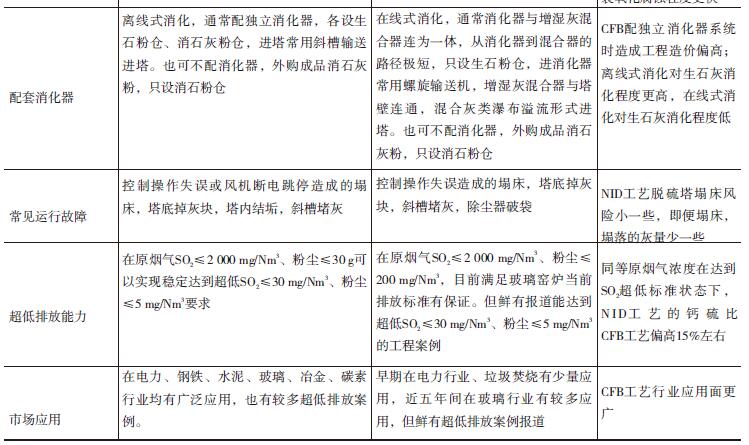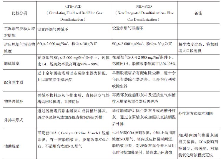 煙氣循環流化床CFB-FGD、 NID-FGD兩種半干法脫硫除塵治理工藝技術體系對比見表1。