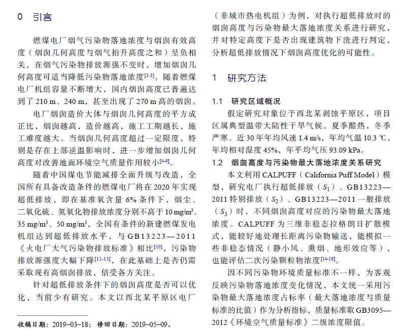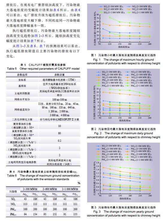 摘 要:燃煤電廠全面實施超低排放后,煙氣污染物排放水平大幅降低,是否仍需采用高煙囪排放已引起關注。以平原區不同容量燃煤電廠為例,對超低排放水平下煙囪高度與污染物最大落地濃度關系進行研究,并對特定高度下是否出現建筑物下洗進行判定,分析煙囪高度優化的可能性。研究結果表明:平原區燃煤電廠執行超低排放限值后,300 MW、600 MW、1 000 MW級機組煙囪從現有推薦高度分別降低至130 m、140 m、150 m時,污染物最大落地濃度增幅不顯著,初步判定污染物增加幅度可接受且不會出現建筑物下洗,煙囪高度存在優化降低的空間。